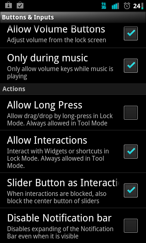 WidgetLocker also boasts a highly variable and detailed settings menu. From here you can alter everything from which buttons unlock the screen to what WidgetLocker-specific widgets you want to use. You can also customize the look and feel of everything and a whole host of other things. If there's something you want to control, there's probably a menu option for it.