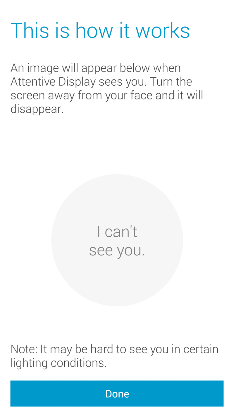 We can choose to embrace both sides of Attentive Display, or one, or none. Stay on while I'm looking is pretty self-explanatory, and Battery Saver mode will have your screen turn off quicker when it can't see you. Keep in mind that low-light warning from before, as this setting could have you turning your screen back on more frequently during that midnight reading I mentioned.
