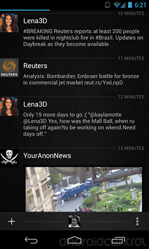 Pull down to refresh, and the timeline tilts on you to show that it's refreshing. It's much cooler than Android's stock method of a glowing light at the top of the list, and it gives it sort of a Star Wars opening crawl look. A number will pop up after the refresh, showing how many new tweets are in that timeline. (Be sure to note the animation here. Nice touch.)