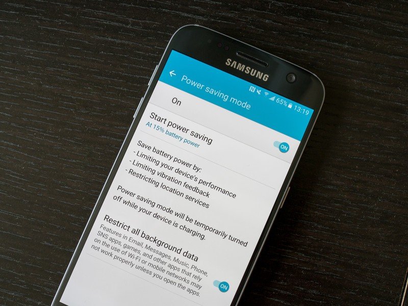 When you turn Power saving mode on, your phone will do a handful of things to eke out a handful of extra percentage points when your battery reserves are low. The Galaxy S7 will limit its performance, turn off vibration feedback and restrict location services to offer battery savings with minimal effect on your use of the phone. If you want to go a step further, tap the settings toggle to restrict all background data, which will keep apps from using data while they aren't open and in use. You can set Power saving mode to turn on automatically at 50, 20, 15 or 5% battery, or you can just toggle it on manually as you need.