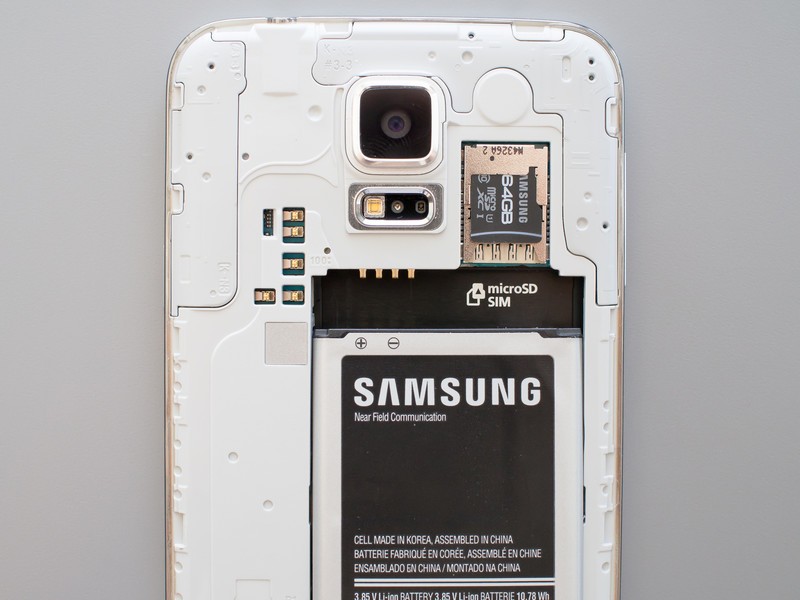 Unlike some phones, the Galaxy S5 requires you to remove the battery from the phone before removing the SD card. Lift up on the battery from the bottom where there's a small notch to place your finger, and it'll come out with ease. The battery doesn't have to be removed completely to get the SD card in, but there's no harm in taking it out — you'll put it back in place in short order.