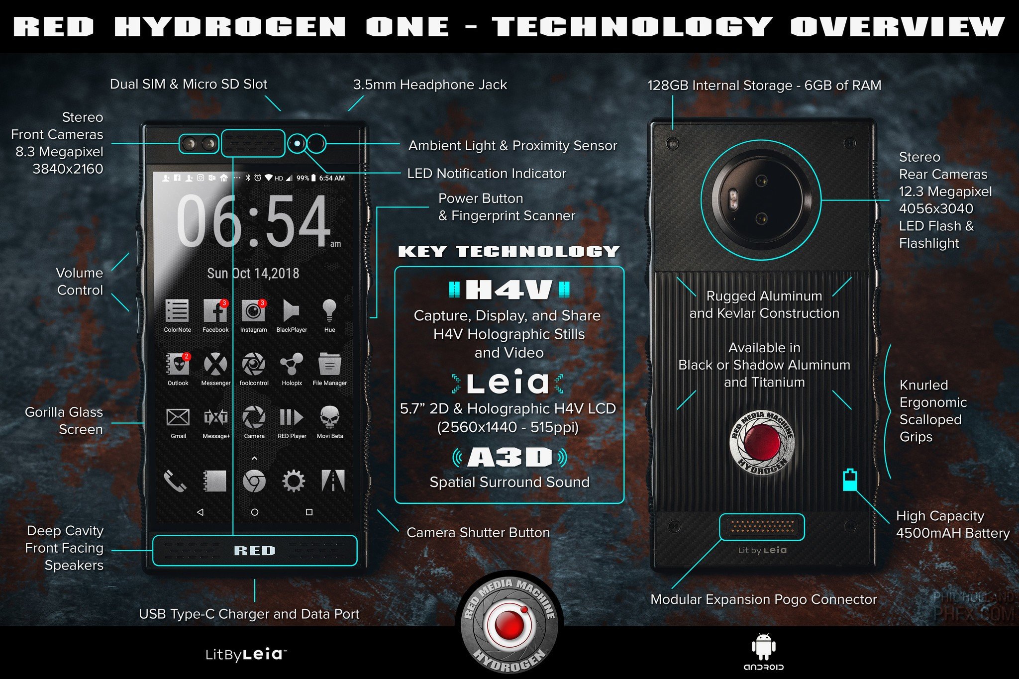The infographic goes on to highlight three of the Hydrogen One's key technologies, including its H4V holographic video and still image capturing, Leia holographic 5.7-inch 2560 x 1440 H4V display, and A3D spatial surround sound.