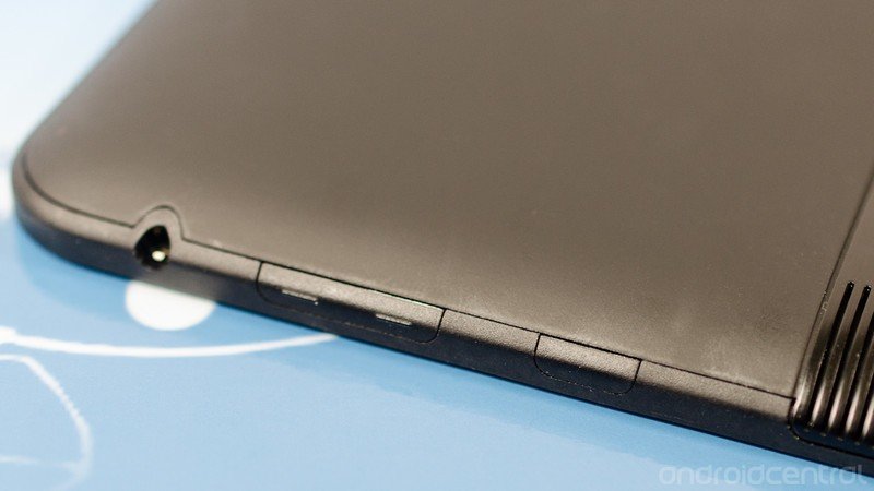 When you hold the Kindle Fire HD in landscape (horizontally), you'll find a 1.3MP camera at top center, and nothing else on the entire face of the device. There are no physical or capacitive buttons to be found; instead you navigate around with software buttons and gestures -- we'll get to that. On the right side you'll find a 3.5mm headphone jack, the volume rocker, and the most annoying power switch known to man. It sets flush, and has no raised portion to indicate that you're touching it. If you work with your hands, or play guitar, or sew, or do anything that gets the tips of your fingers even slightly hard or calloused, you'll need to look every time you want to press it. I know you're probably thinking "why is he railing on about a power switch", but trust me -- you will swear and curse at it until your fingers learn where it is. Then you'll curse a little less. On the bottom of the tablet is a microHDMI port and a microUSB port. A pinhole microphone is nestled snugly on the bottom as well.