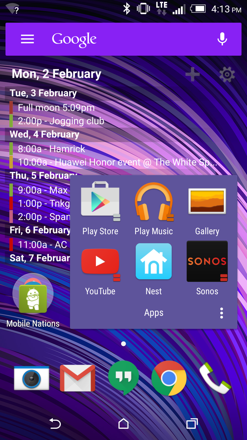 Like me, my home screens aren't particularly exciting. They also haven't changed all that much in quite some time. In fact, I only need a single screen. I'm still using Pure Calendar Widget for the bulk of the screen. It's especially useful when we're at events, and so I just leave it there all the time, usually with a transparent background so it's pretty much just text on the screen. In fact, I'm really not a huge fan of widgets, since they're all designed differently and never really seem to play together all that nicely. Other than that, it's folders, labeled by function. I've got one for all the Mobile Nations apps. Another for the social apps — Google+, Facebook, Instagram, etc. Another for apps I use fairly often. And finally one for all my travel apps — Delta, Tripit, Uber and Google Maps.