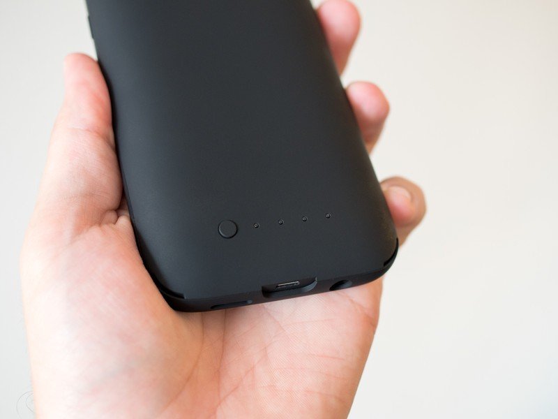 Whereas Samsung did something fresh with its battery case by charging the phone wirelessly to cut down on extra bulk, Mophie is taking its more traditional design by still charging the phone over its Micro-USB port. That means you're getting a full-coverage case that's going to add a considerable amount of bulk, and because of the Micro-USB plug you're going to have a nice little "chin" on the bottom of the phone to boot.