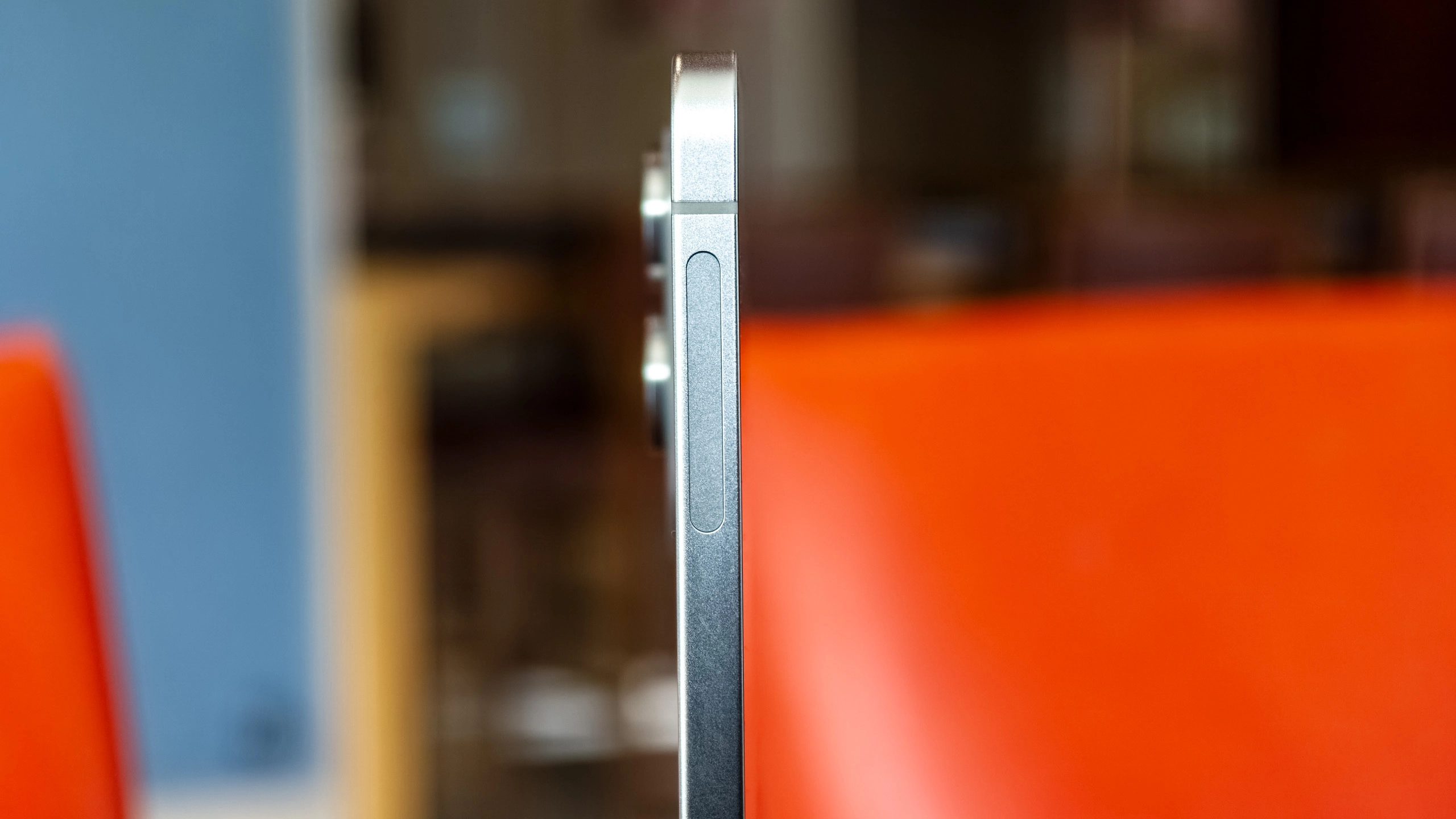 A close-up of the camera plateau of an iPhone Air in Sky Blue on a blue chair.