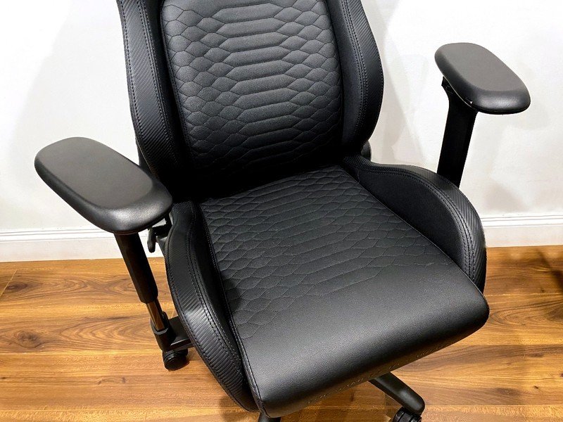 Once together, the Razer Iskur is a sight to behold. The Iskur uses high-quality multi-layer synthetic leather, which looks great and quite expensive. The black Razer Iskur does away with the Razer's standard green stitching, so if you're looking for a gaming chair that's lowkey and doesn't scream Twitch streamer, this is a good bet. The 4D handles allow for different heights and angles and can be adjusted easily by pressing the button hidden on the handle.