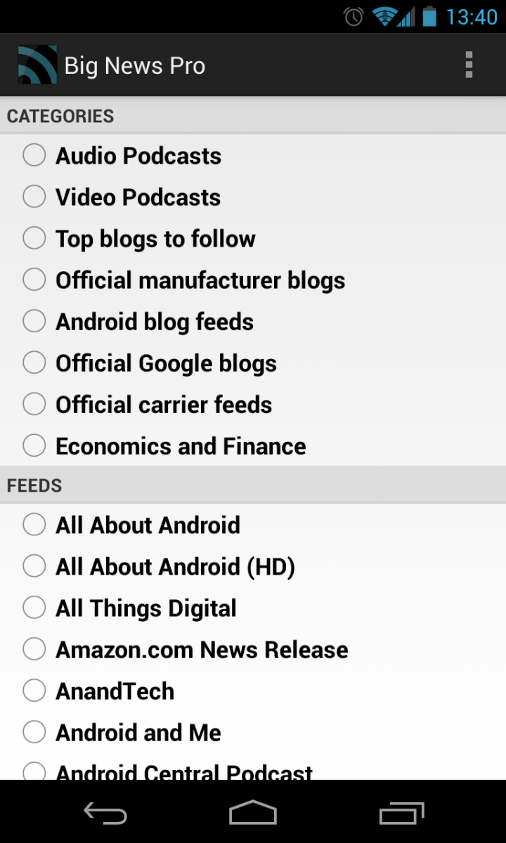 Accessing Big News from the app drawer basically takes you into the settings menu, where you can choose which feeds should be displayed and further tweak advanced settings. The aforementioned widget settings are available here, as well as auto sync options, and the ability to turn on notifications for Jelly Bean devices (more on this below.)