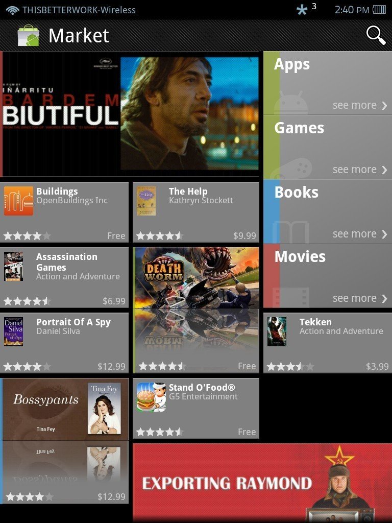Also included, as should be on any Android tablet you're considering, is the Android Market. In fact, all the Google apps, shy of the ones that need a cellular connection like Google Voice, work really well on the Vizio. Because you're not using Honeycomb, you'll be using the phone versions, but most apps scale well to the odd (for Android anyway) 1024x768 resolution.
