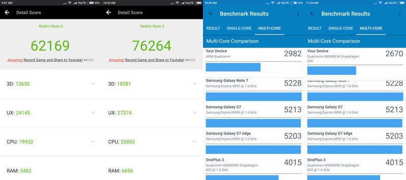 The GPU is also a point of contention, with the Adreno 506 on the Redmi Note 4 said to be a downgrade from the Redmi Note 3's Adreno 510. Synthetic benchmarks also show that the Redmi Note 3 is faster both at GPU and CPU computing. That said, you won't notice any difference in day-to-day usage between the Redmi Note 3 and Redmi Note 4, with both phones offering similar performance in visually-demanding titles.